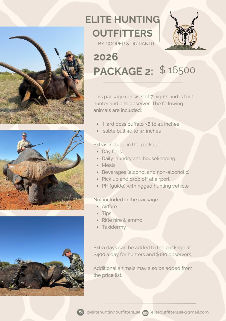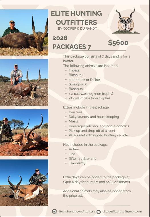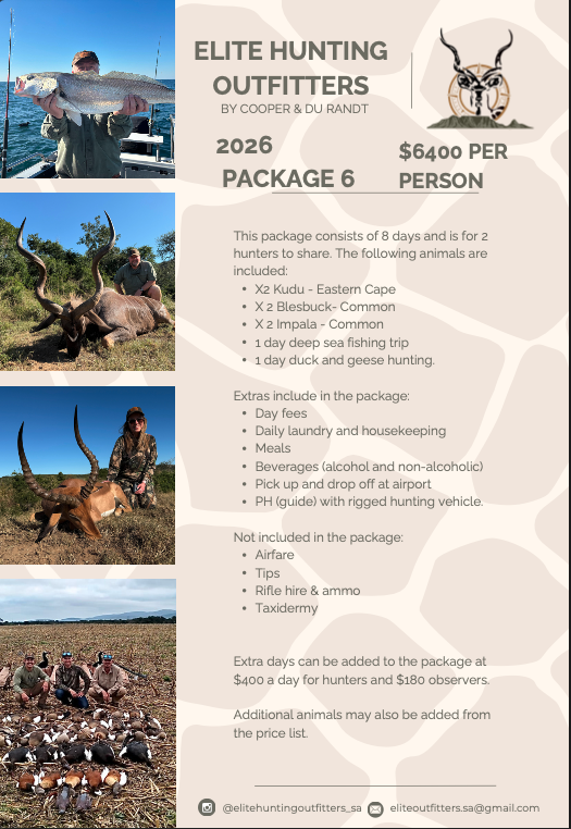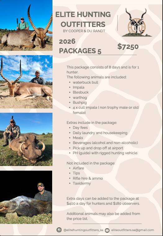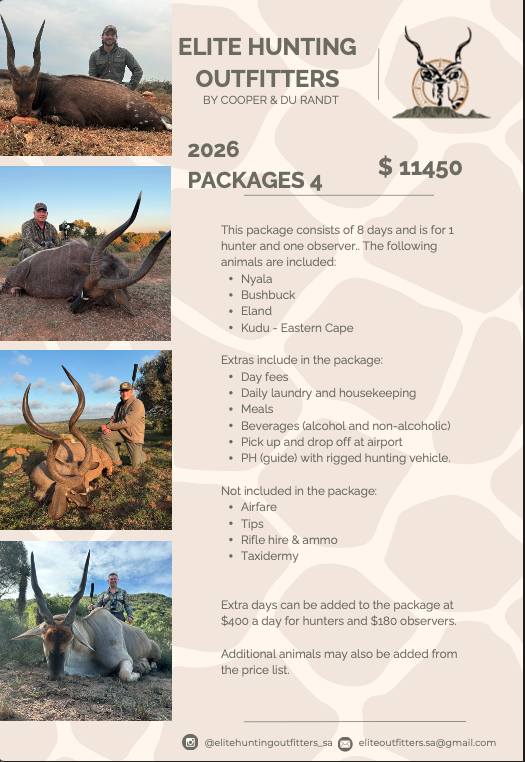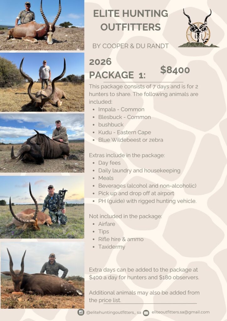 At Elite Hunting Outfitters, we believe your African safari should be more than just a hunt—it should be the experience of a lifetime. Located in the heart of South Africa’s Eastern Cape, we offer ethical, fair-chase hunts led by expert professional hunters who know the land and the game like no one else. Whether you’re pursuing your first kudu or chasing a full plains or dangerous game package, we tailor each safari to your goals and skill level. With luxury lodging, gourmet meals, and breathtaking scenery, every detail is crafted for comfort, adventure, and authenticity. Hunt with confidence. Hunt with Elite.