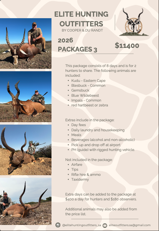 Elite Hunting Outfitters delivers unforgettable guided safaris across South Africa, crafted for those who seek more than just a trophy — they seek the experience. Rooted in tradition, driven by passion.